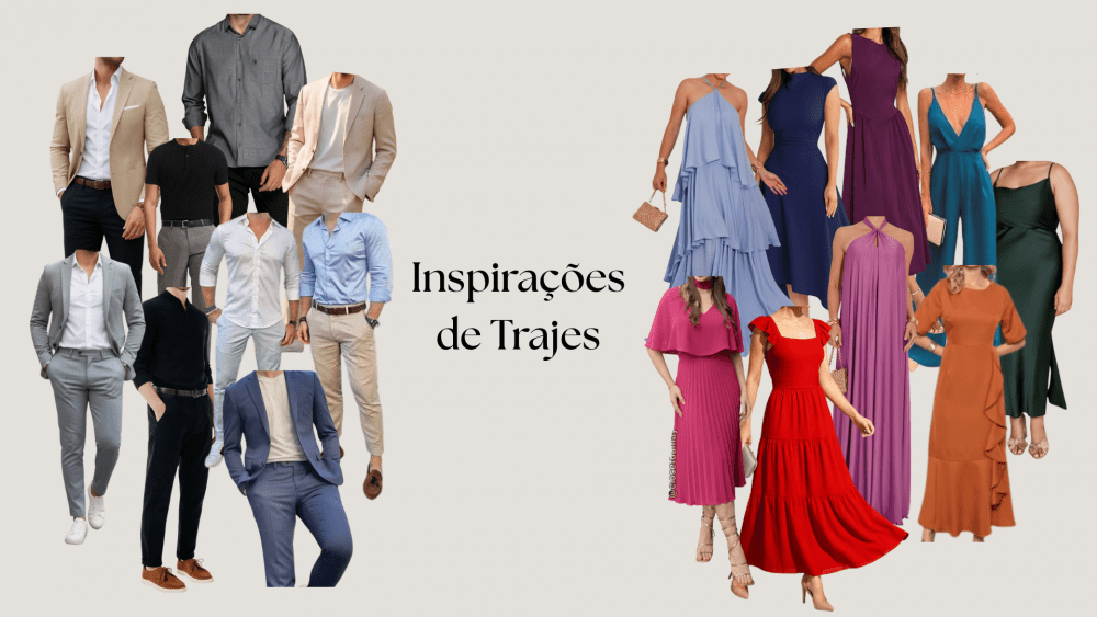 Para as mulheres, não usar branco. Também gostaríamos de reservar as cores preto (para as madrinhas), verde esmeralda e azul royal (para as mães), para que esses momentos e pessoas tão importantes tenham seu destaque 💐